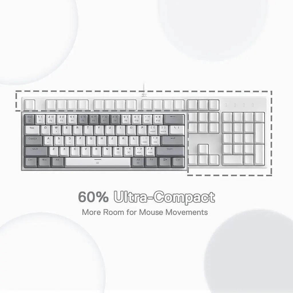 Redragon 60% keyboard in wired mode with fresh 2 colors mixed keycaps layout. Ultra-compact 61 keys with novel keycap color frees up precious desk space with vibrant elements. Up to 20 presets backlighting modes are free to choose by the keyboard itself. Brightness and flowing speed is also adjustable on board. Select your own preferred modes for any playing.